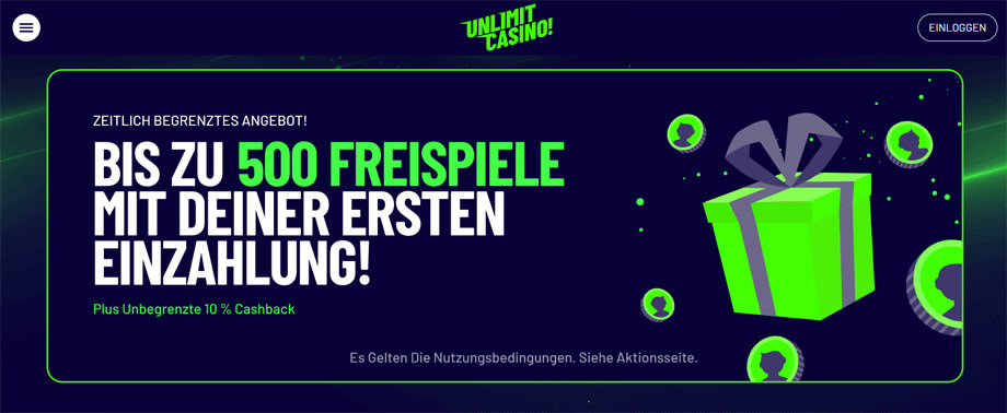 Unlimit Gambling erbjuder både skattefria intäkter och en iögonfallande bonus till sina spelare. De välkomnar helt nya individer med ett paket som består av upp till 500 gratis rotationer utan några omsättningskrav, och ger också en vanlig cashback på 10 %.